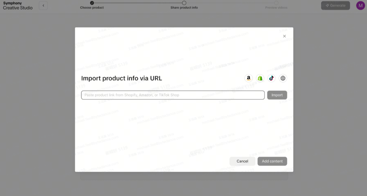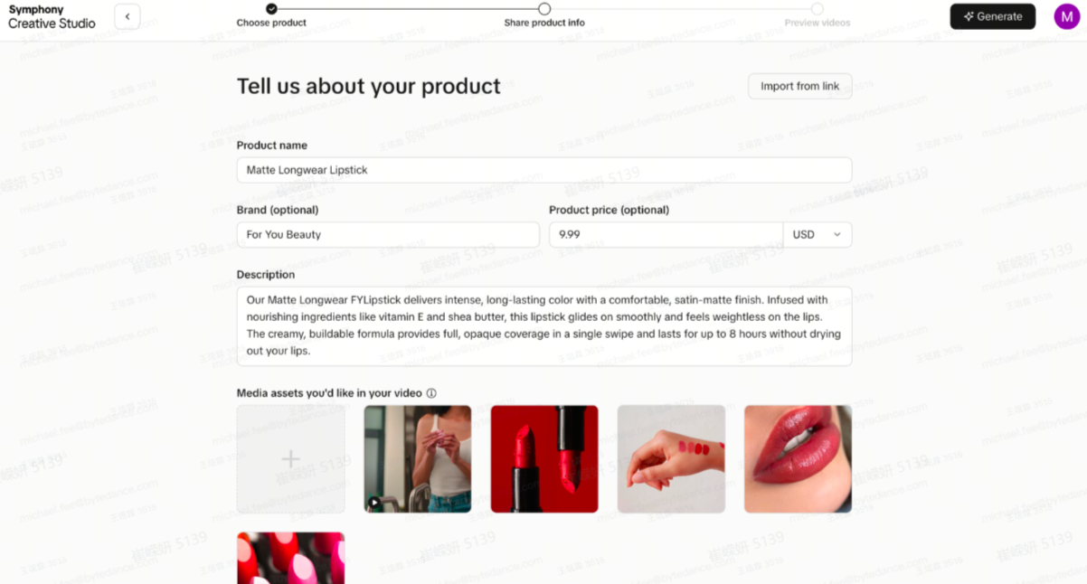 2、点击右上角import from link输入亚马逊/TikTok Shop/Shopify/App商店页等链接导入相关产品信息和资产。