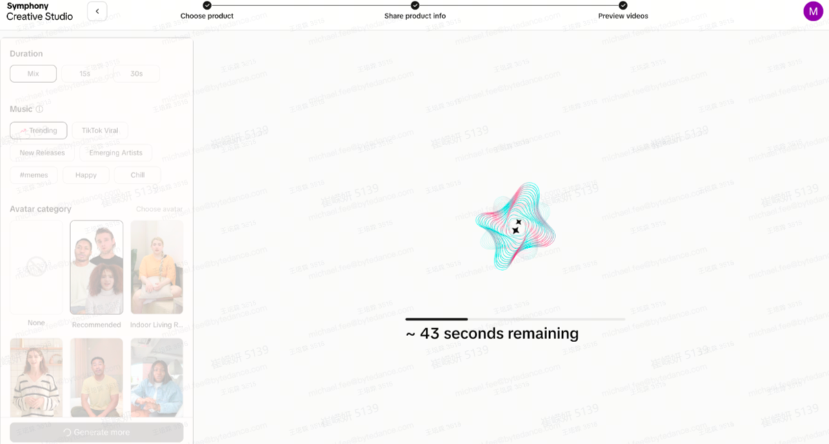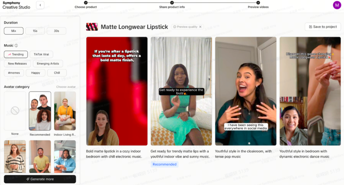 6、预览生成的AI视频,这些视频以多种格式和脚本风格生成。如果需要,可以在左侧设置中更改视频时长、音乐或数字人,然后点击生成更多。等到对视频完全满意,可以直接导出到TTAM或下载到设备上。