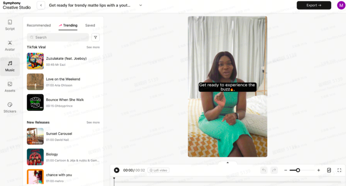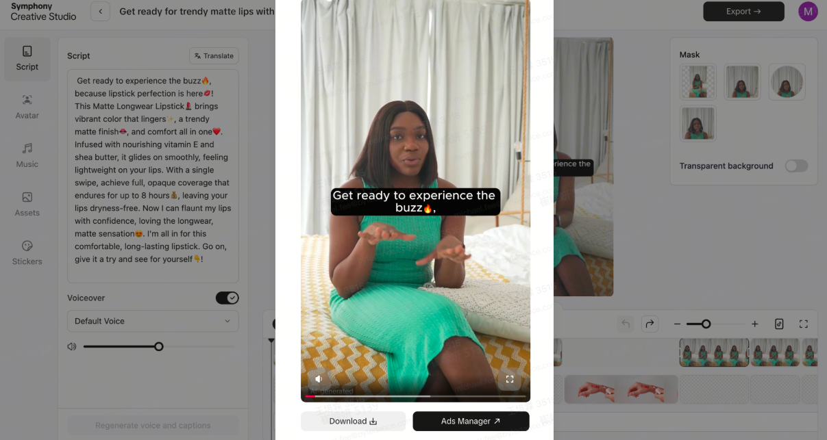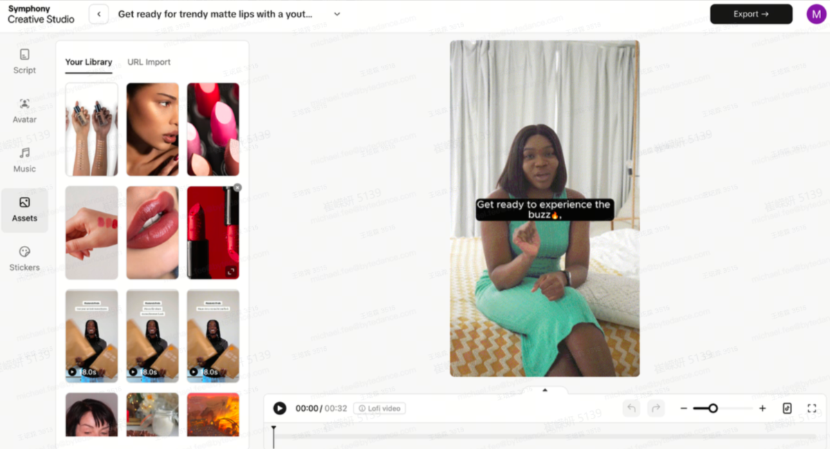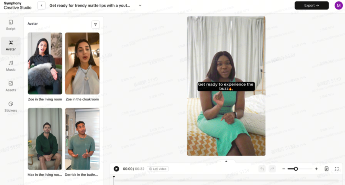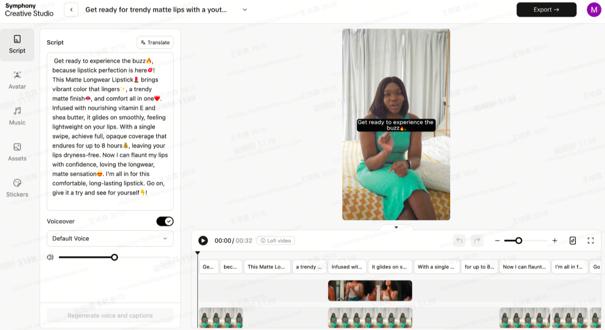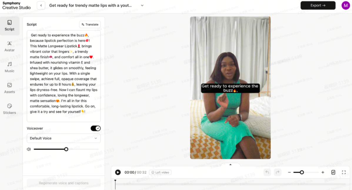 9、完成编辑后,点击右上角的Export,渲染视频大约需要2分钟,包括将语音/配音与口型同步。广告主可以直接下载视频或导出到TTAM,另外需要注意所有导出的视频都会自动添加AIGC标签。