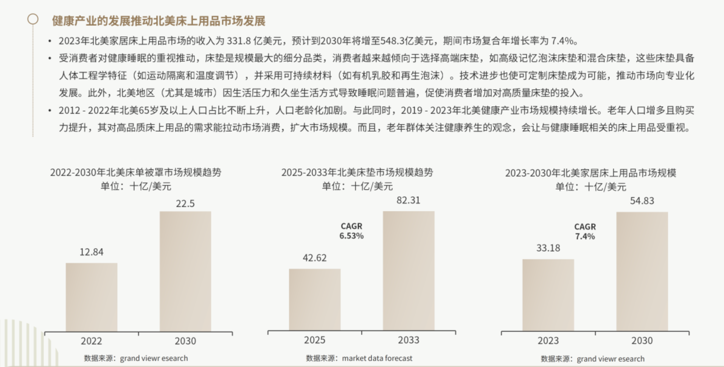 对于主营床上用品的跨境电商卖家来说,北美市场呈现出广阔的商业前景与严峻的竞争态势并存的格局。据统计,2023年该地区家居床上用品市场规模已达331.8亿美元,并有望在2030年增长至548.3亿美元,期间年均复合增长率预计保持在7.4%。作为该区域的核心市场,美国家居床上用品销售额至2030年预计将突破422亿美元。