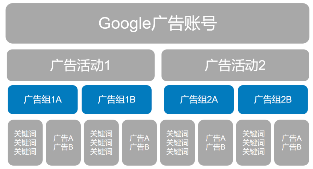 账户 → 广告系列(按产品/目标划分) → 广告组(按细分主题或关键词分组) → 广告与关键词。