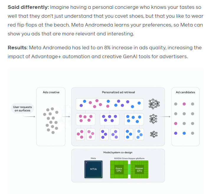许多广告主可能感觉,Meta广告系统的显著变化是近期才发生的。但实际上,“Andromeda”(仙女座)作为新一代AI广告检索引擎,早在2024年底就已由Meta正式推出。而大家在今年才开始有明显感知的核心原因,则在于系统的不断迭代与数据的积累。经过数月的运行与学习,这个基于NVIDIA先进硬件构建的“超级大脑”已愈发成熟,处理因广泛定向和GenAI创意激增的广告库存时愈发得心应手。这直接导致了从今年开始,依赖旧有精准定位方法的广告效果普遍下滑,而拥抱系统自动化的账户则表现愈发稳健——这不是偶然,而是技术演进下的必然结果。