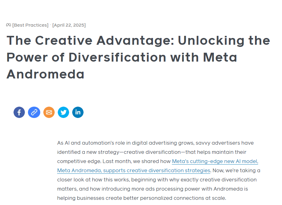 Meta广告新算法“Andromeda”(仙女座)通过“阅读”素材内容来理解广告意图,因此建议Meta广告主们需要注意,持续提供丰富、优质、多样的广告素材至关重要。