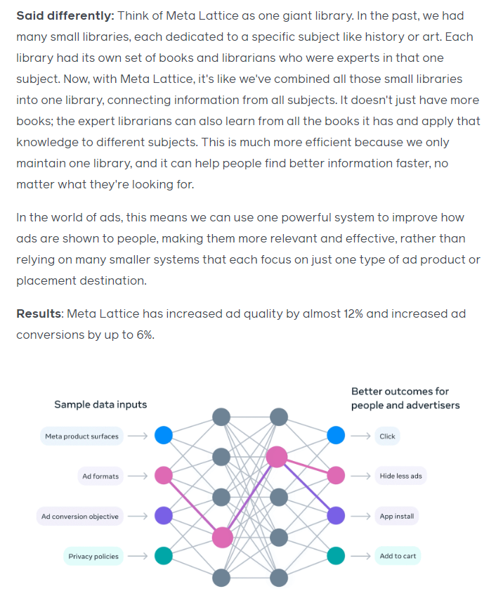 Meta广告“Andromeda”(仙女座)时代,简化账户结构与优化创意同样重要。这背后也与Meta底层AI排序系统 Lattice 的全面部署有关——它能将多个分散的广告模型整合为更强大、更统一的基础模型,从而处理更复杂的优化任务。过于复杂的广告结构会分割数据,阻碍AI的整体学习能力。