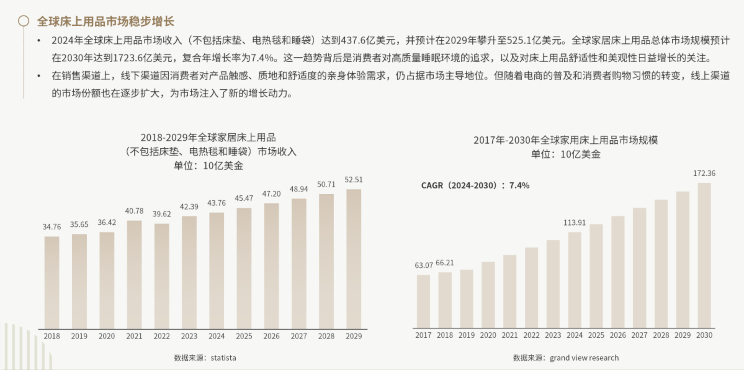 随着全球”睡眠经济”崛起,床上用品出海已成为跨境电商首选的热门赛道。根据跨境市场洞察显示,这一品类正从”低频耐用品”向”高频体验品”转型。全球家居床上用品总体市场规模预计在2030年达到1723.6亿美元,2024~2030复合年增长率为7.4%。 这一增长背后,是消费者对睡眠质量与床品体验的持续追求——从单纯的功能满足转向对舒适、健康、美学的全方位需求。