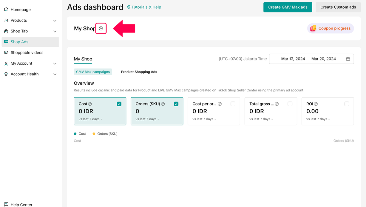 登录TikTok 商家中心,点击左侧 “店铺广告”,选择 “创建 GMV Max 广告”。如需切换广告账户,点击顶部齿轮图标即可。