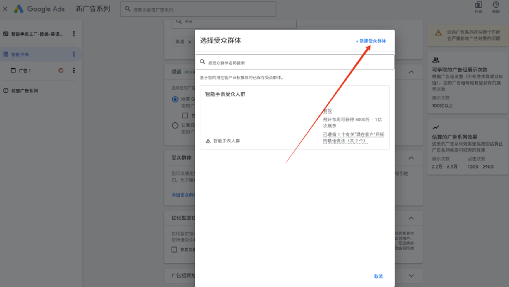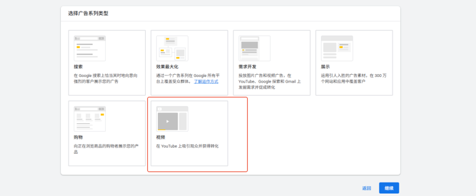 登录Google Ads后台,点击“创建”按钮,选择“广告系列”。目标建议选择“潜在客户”,广告类型选择“视频—在Youtube上吸引观众并获得转化”。
