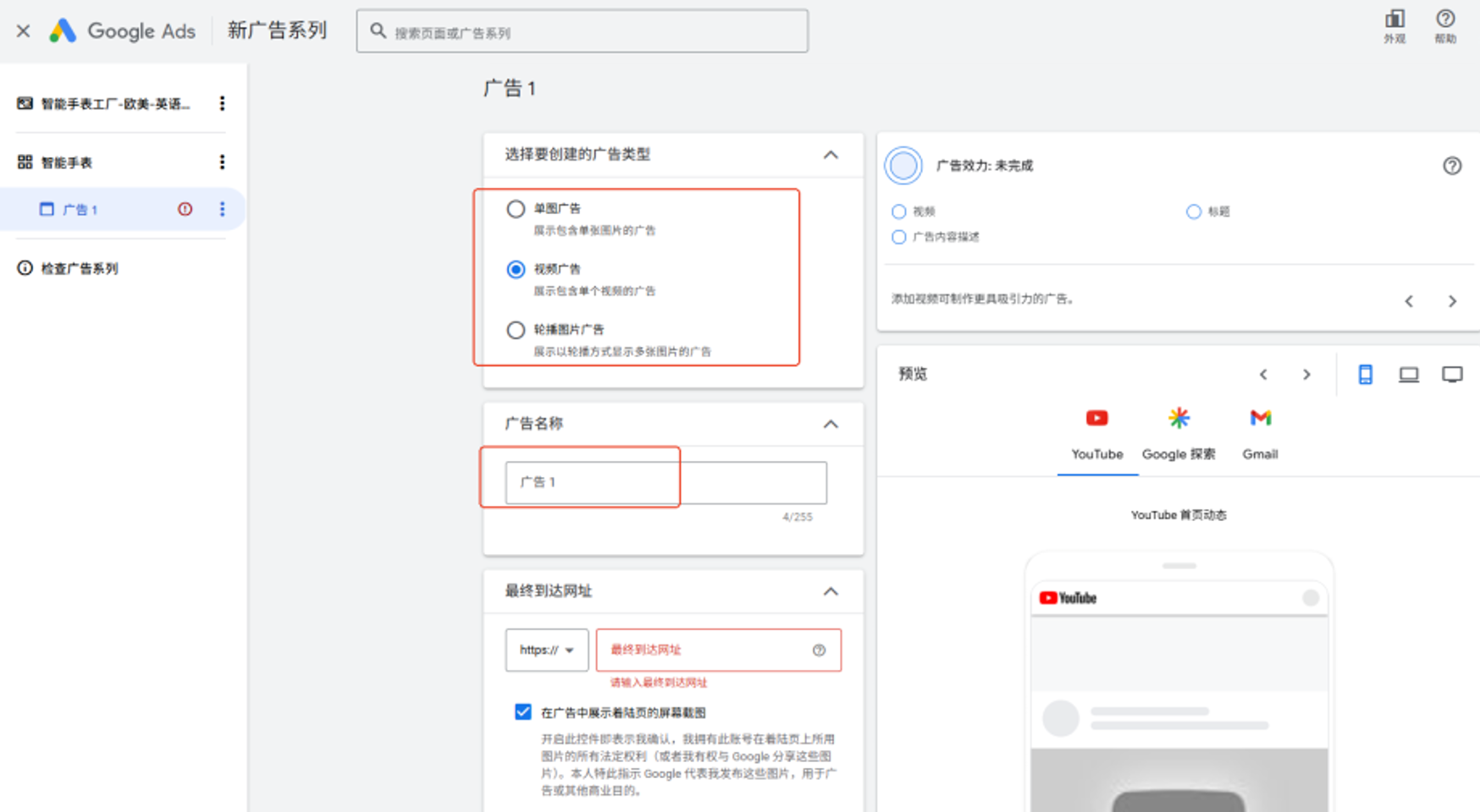 选择广告格式:若无视频,可选单图或轮播广告;若有视频,需提前上传至YouTube并获取链接。