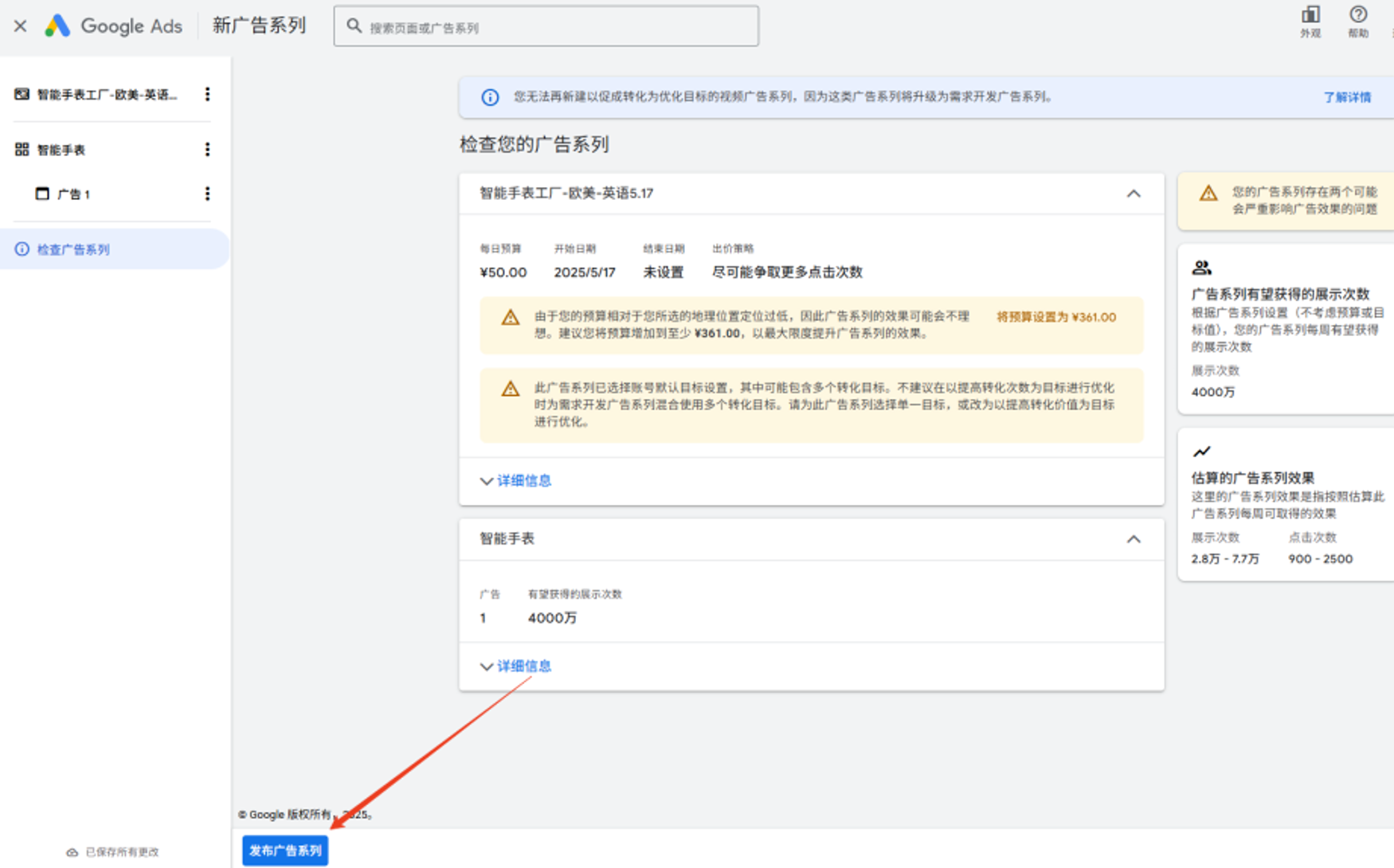 上传徽标(网站Logo或图标),确认最终到达网址。前往检查页面核对信息,无误后点击“发布广告系列”,等待审核即可。