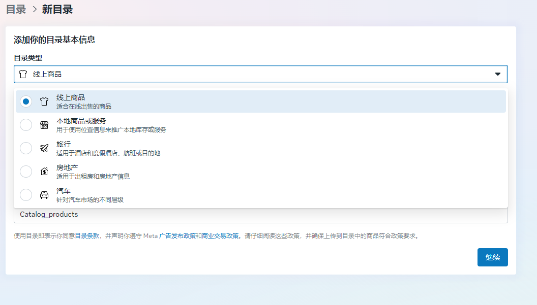5、添加目录(如果您有广告账户的话,如果您目前暂时没有广告账户,可以通过公众号私信联系YinoLink易诺开通广告账户噢~)选择现有目录或点击新建目录。您需要在完成设置后向目录添加商品。您只能为电商账户绑定一个目录。